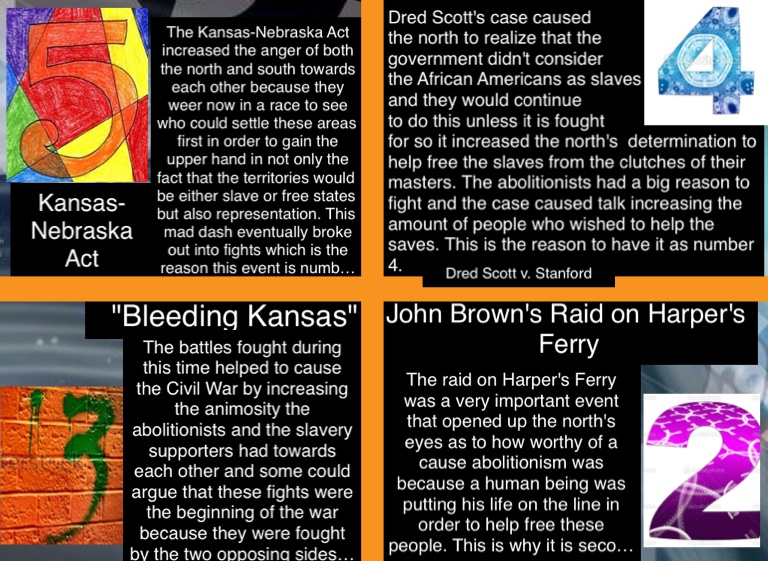The Kansas-Nebraska Act increased the anger of both the north and south towards each other because they weer now in a race to see who could settle these areas first in order to gain the upper hand in not only the fact that the territories would be either slave or free states but also representation. This mad dash eventually broke out into fights which is the reason this event is number five.