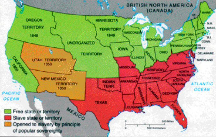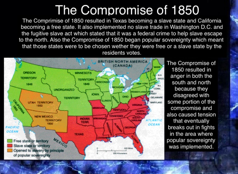The Comprimise of 1850 resulted in Texas becoming a slave state and California becoming a free state. It also implemented no slave trade in Washington D.C. and the fugitive slave act which stated that it was a federal crime to help slave escape to the north. Also the Compromise of 1850 began popular sovereignty which meant that those states were to be chosen wether they were free or a slave state by the residents votes.