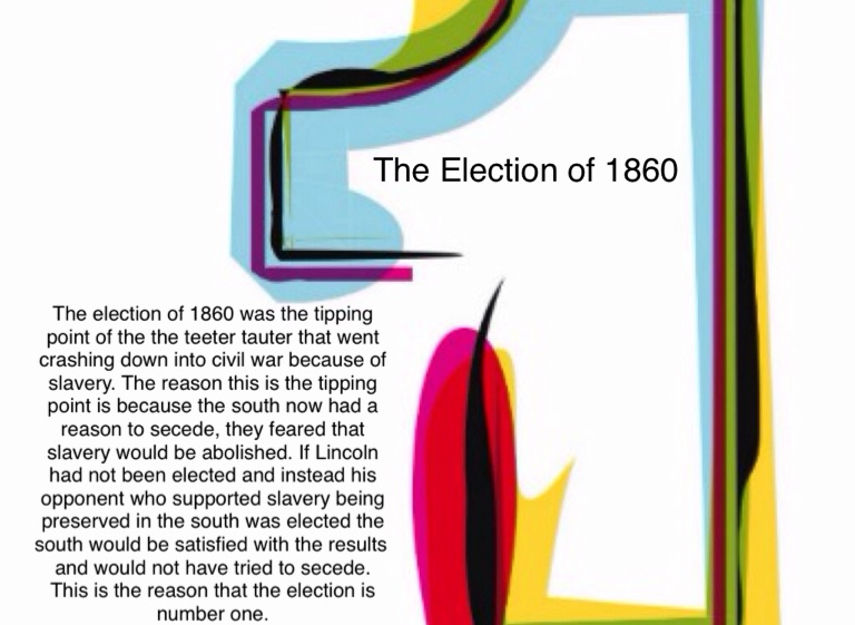 The election of 1860 was the tipping point of the the teeter tauter that went crashing down into civil war because of slavery. The reason this is the tipping point is because the south now had a reason to secede, they feared that slavery would be abolished. If Lincoln had not been elected and instead his opponent who supported slavery being preserved in the south was elected the south would be satisfied with the results and would not have tried to secede. This is the reason that the election is number one.