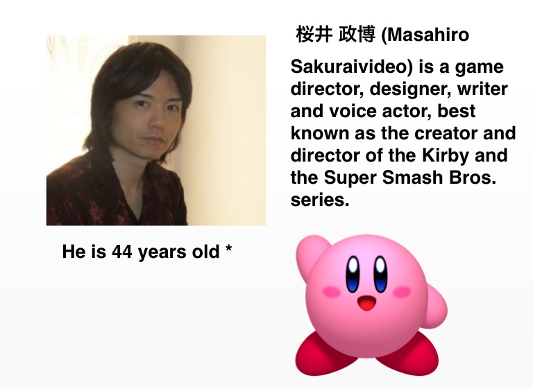 桜井 政博 (Masahiro Sakuraivideo) is a game director, designer, writer and voice actor, best known as the creator and director of the Kirby and the Super Smash Bros. series.