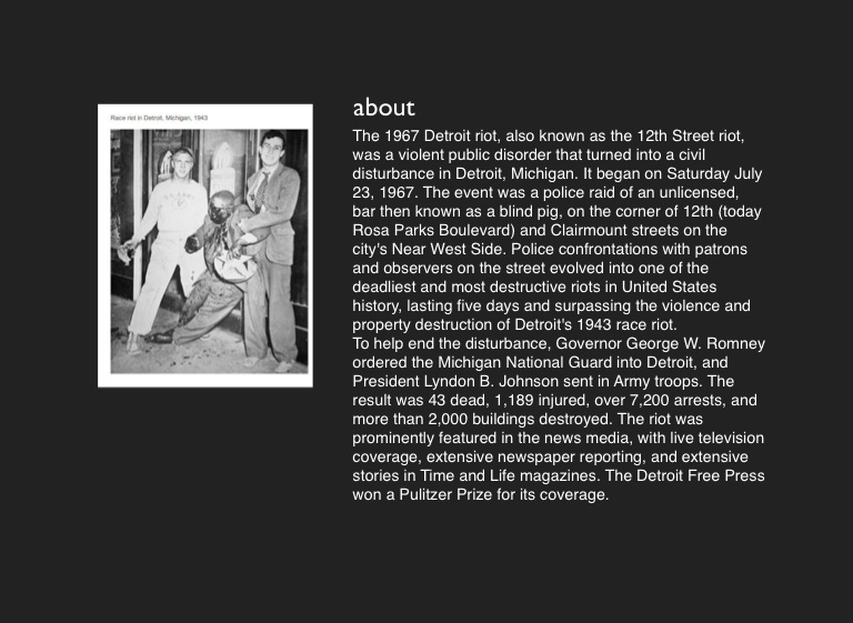 The 1967 Detroit riot, also known as the 12th Street riot, was a violent public disorder that turned into a civil disturbance in Detroit, Michigan. It began on Saturday July 23, 1967. The event was a police raid of an unlicensed, bar then known as a blind pig, on the corner of 12th (today Rosa Parks Boulevard) and Clairmount streets on the city's Near West Side. Police confrontations with patrons and observers on the street evolved into one of the deadliest and most destructive riots in United States history, lasting five days and surpassing the violence and property destruction of Detroit's 1943 race riot.