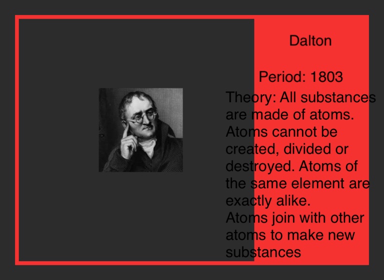Theory: All substances are made of atoms. Atoms cannot be created, divided or destroyed. Atoms of the same element are exactly alike.
