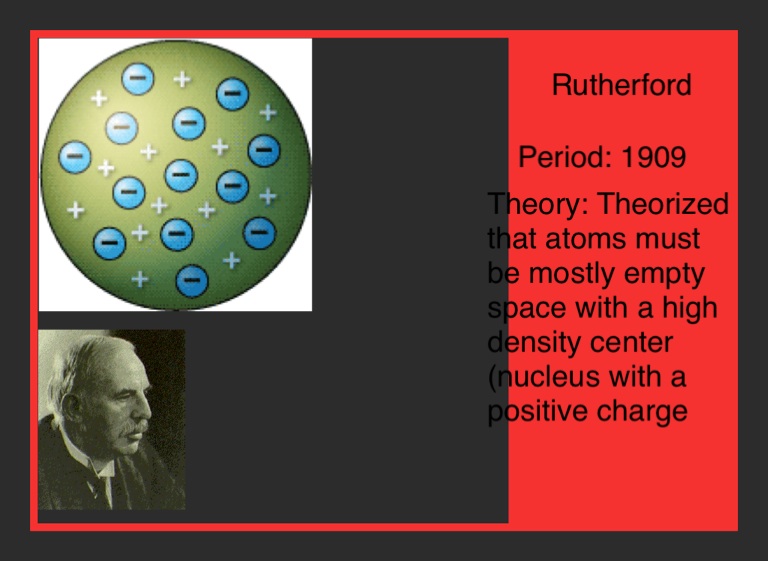 Theory: Theorized that atoms must be mostly empty space with a high density center (nucleus with a positive charge
