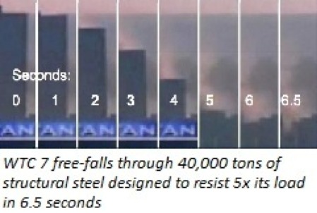 Building 7 is a 47-story, steel-framed, fire-protected, high-rise office building located about a football field’s length from the WTC North Tower. It was not hit by a plane and only had isolated pockets of fire in ten floors, it suddenly imploded, coming down neatly and symmetrically at 5:20 pm. 7 hours after the south and north towers collapsed.