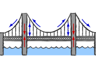 Compression and Tension- In all suspension bridges, the roadway hangs from massive steel cables, which are draped over two towers and secured into solid concrete blocks, called anchorages, on both ends of the bridge. The cars push down on the roadway, but because the roadway is suspended, the cables transfer the load into compression in the two towers. The two towers support most of the bridge's weight.