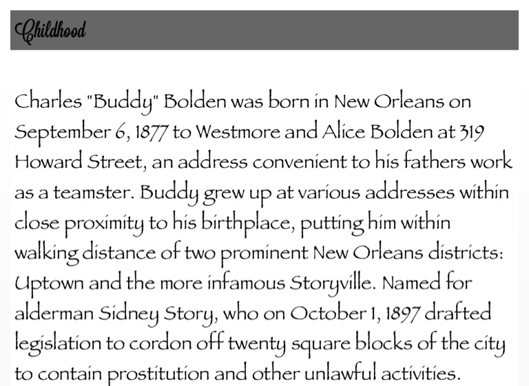 Charles "Buddy" Bolden was born in New Orleans on September 6, 1877 to Westmore and Alice Bolden at 319 Howard Street, an address convenient to his fathers work as a teamster. Buddy grew up at various addresses within close proximity to his birthplace, putting him within walking distance of two prominent New Orleans districts: Uptown and the more infamous Storyville. Named for alderman Sidney Story, who on October 1, 1897 drafted legislation to cordon off twenty square blocks of the city to contain prostitution and other unlawful activities.