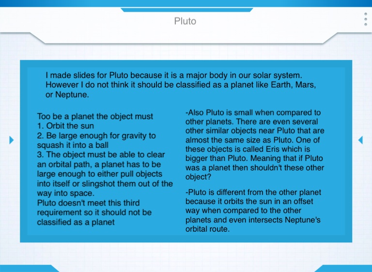 I made slides for Pluto because it is a major body in our solar system. However I do not think it should be classified as a planet like Earth, Mars, or Neptune.
