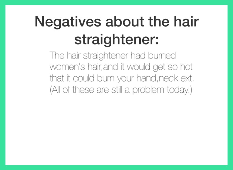 The hair straightener had burned women's hair,and it would get so hot that it could burn your hand,neck ext.(All of these are still a problem today.)