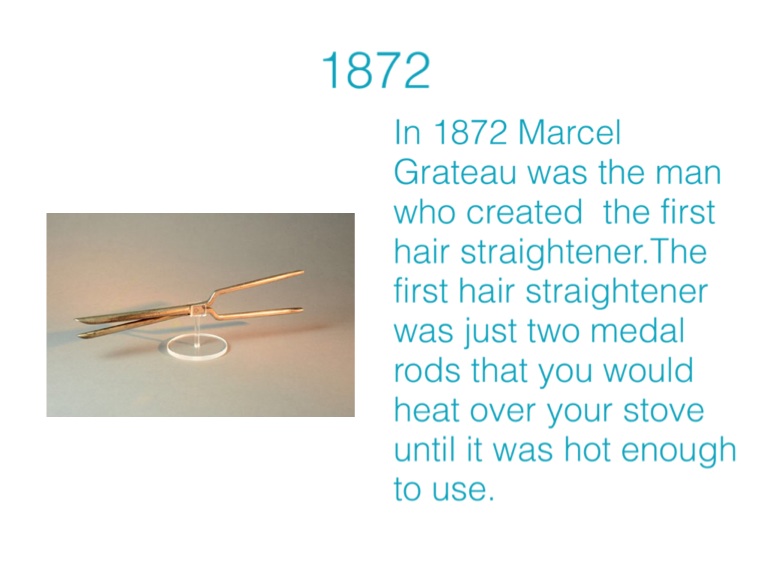 In 1872 Marcel Grateau was the man who created the first hair straightener.The first hair straightener was just two medal rods that you would heat over your stove until it was hot enough to use.
