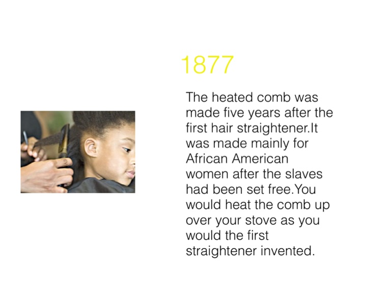 The heated comb was made five years after the first hair straightener.It was made mainly for African American women after the slaves had been set free.You would heat the comb up over your stove as you would the first straightener invented.