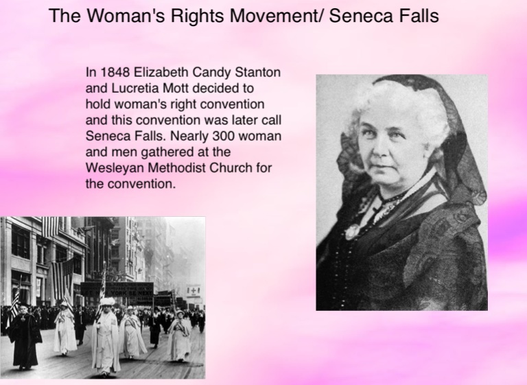 In 1848 Elizabeth Candy Stanton and Lucretia Mott decided to hold woman's right convention and this convention was later call Seneca Falls. Nearly 300 woman and men gathered at the Wesleyan Methodist Church for the convention.