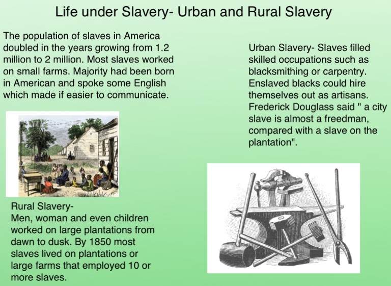 Urban Slavery- Slaves filled skilled occupations such as blacksmithing or carpentry. Enslaved blacks could hire themselves out as artisans. Frederick Douglass said " a city slave is almost a freedman, compared with a slave on the plantation".