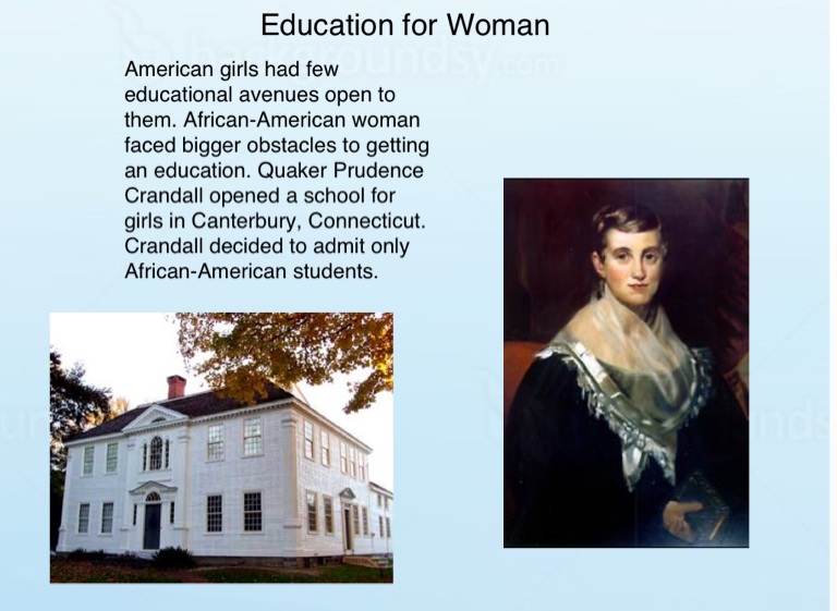 American girls had few educational avenues open to them. African-American woman faced bigger obstacles to getting an education. Quaker Prudence Crandall opened a school for girls in Canterbury, Connecticut. Crandall decided to admit only African-American students.