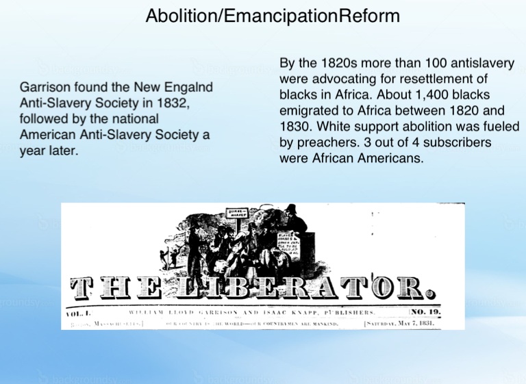 By the 1820s more than 100 antislavery were advocating for resettlement of blacks in Africa. About 1,400 blacks emigrated to Africa between 1820 and 1830. White support abolition was fueled by preachers. 3 out of 4 subscribers were African Americans.