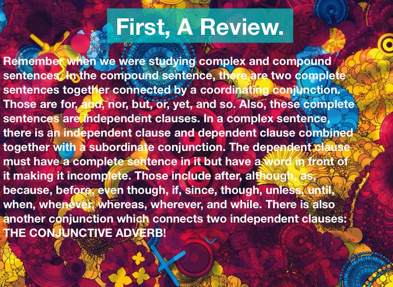 Remember when we were studying complex and compound sentences. In the compound sentence, there are two complete sentences together connected by a coordinating conjunction. Those are for, and, nor, but, or, yet, and so. Also, these complete sentences are independent clauses. In a complex sentence, there is an independent clause and dependent clause combined together with a subordinate conjunction. The dependent clause must have a complete sentence in it but have a word in front of it making it incomplete. Those include after, although, as, because, before, even though, if, since, though, unless, until, when, whenever, whereas, wherever, and while. There is also another conjunction which connects two independent clauses: THE CONJUNCTIVE ADVERB!