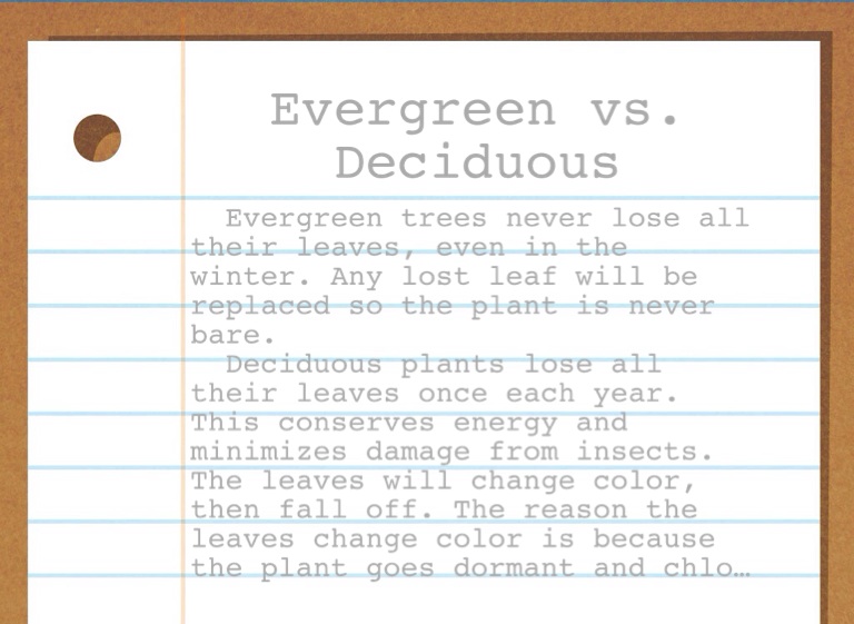 Evergreen trees never lose all their leaves, even in the winter. Any lost leaf will be replaced so the plant is never bare.