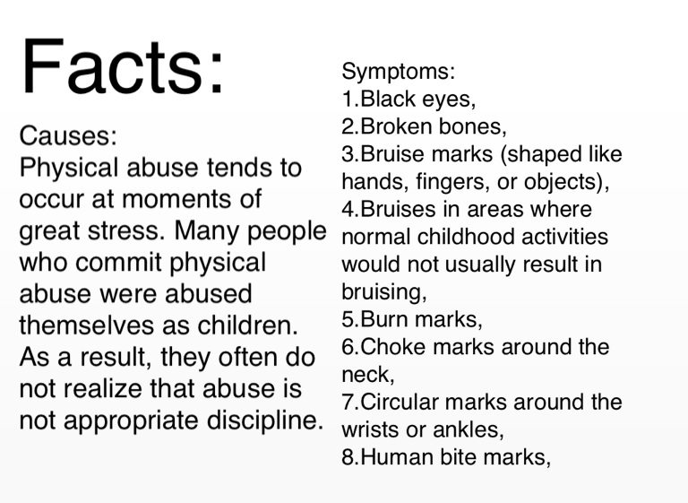 Physical abuse tends to occur at moments of great stress. Many people who commit physical abuse were abused themselves as children. As a result, they often do not realize that abuse is not appropriate discipline.