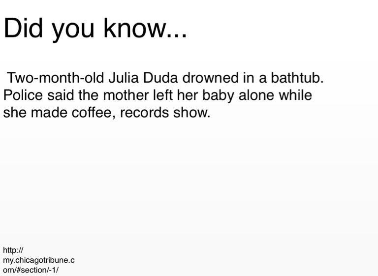 Two-month-old Julia Duda drowned in a bathtub. Police said the mother left her baby alone while she made coffee, records show.