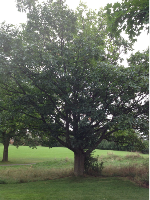 - a mature 30 feet white oak tree located at the edge of a manicured lawn and a longer, wilder long