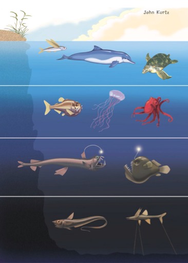 Emphatic Zone: the surface is down about a hundred meters or so. There is enough sunlight to support colonies of tiny plants, and small animals such as plankton.