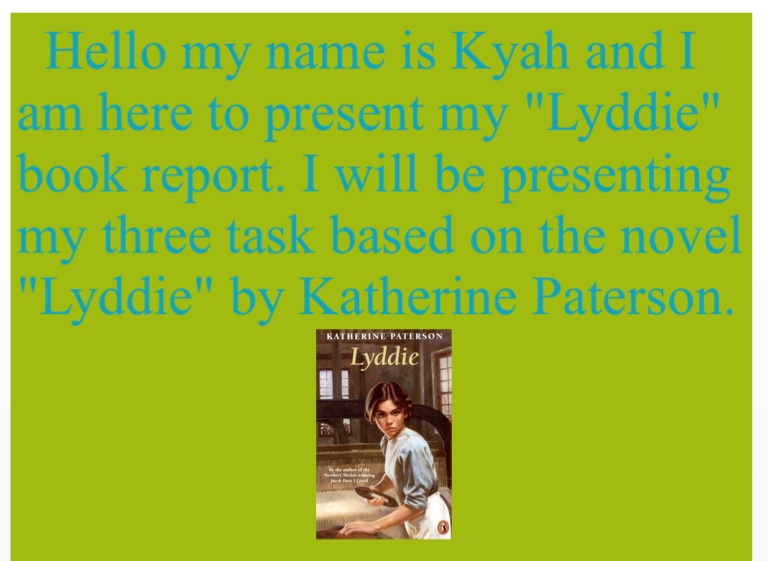 Hello my name is Kyah and I am here to present my "Lyddie" book report. I will be presenting my three task based on the novel "Lyddie" by Katherine Paterson.