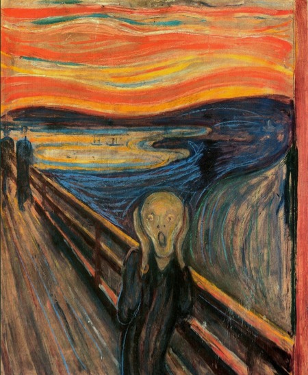 "The Scream" by Edvard Munch conveys a state of insanity. The disturbing face of the person in the foreground reminds me of someone who isn't in his right mind, they don't know what's going on, everything around them and the events they take part in are slowly breaking their sanity and weakening their mind. Also, the rough, scratchiness, of the lines resemble the crazy sketches done by someone who's perhaps lost their mind or is suffering from a traumatic experience. The mess of colors and the way the lines all seem to mesh together, to me, represents who someone in this state of mind might see the word. Finally, after researching this piece I found that the artist himself, in his own personal diaries, admitted to struggling with insanity, as well as other people in his family.