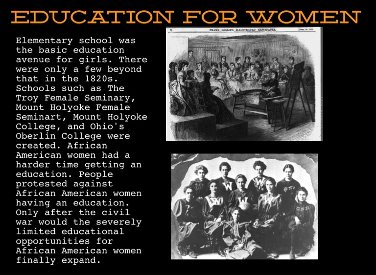 Elementary school was the basic education avenue for girls. There were only a few beyond that in the 1820s. Schools such as The Troy Female Seminary, Mount Holyoke Female Seminart, Mount Holyoke College, and Ohio's Oberlin College were created. African American women had a harder time getting an education. People protested against African American women having an education. Only after the civil war would the severely limited educational opportunities for African American women finally expand.