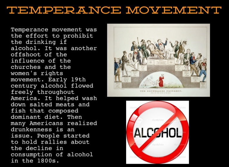 Temperance movement was the effort to prohibit the drinking if alcohol. It was another offshoot of the influence of the churches and the women's rights movement. Early 19th century alcohol flowed freely throughout America. It helped wash down salted meats and fish that composed dominant diet. Then many Americans realized drunkenness is an issue. People started to hold rallies about the decline in consumption of alcohol in the 1800s.