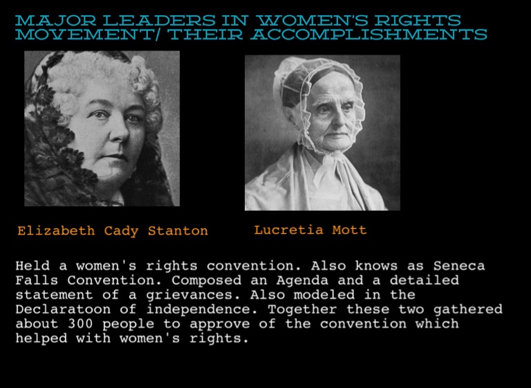 Held a women's rights convention. Also knows as Seneca Falls Convention. Composed an Agenda and a detailed statement of a grievances. Also modeled in the Declaratoon of independence. Together these two gathered about 300 people to approve of the convention which helped with women's rights.