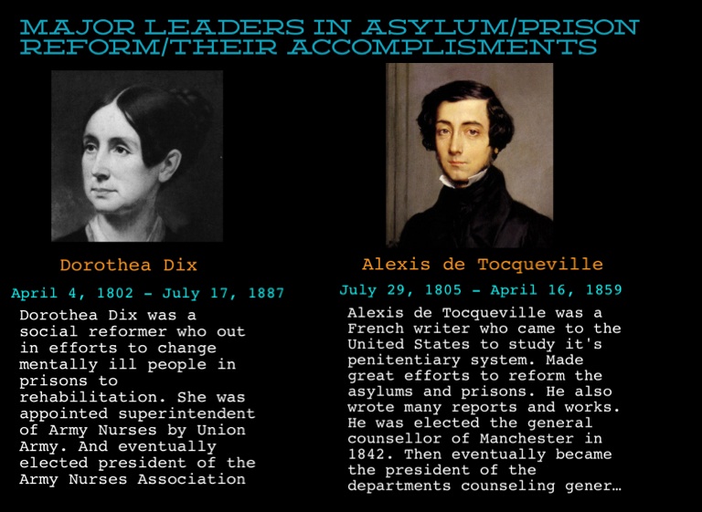 Alexis de Tocqueville was a French writer who came to the United States to study it's penitentiary system. Made great efforts to reform the asylums and prisons. He also wrote many reports and works. He was elected the general counsellor of Manchester in 1842. Then eventually became the president of the departments counseling general