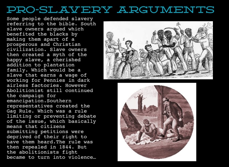 Some people defended slavery referring to the bible. South slave owners argued which benefited the blacks by making them apart of a prosperous and Christian civilization. Slave owners then created a myth of the happy slave, a cherished addition to plantation family. Which would be a slave that earns a wage of working for Pennies in dark airless factories. However Abolitionist still continued the campaign for emancipation.Southern representatives created the Gag Rule. Which was a rule limiting or preventing debate of the issue, which basically means that citizens submitting petitions were deprived of their right to have them heard.The rule was then repealed in 1844. But the abolitionists fight became to turn into violence in the 1850s.