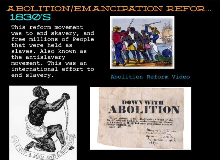 This reform movement was to end skavery, and free millions of People that were held as slaves. Also known as the antislavery movement. This was an international effort to end slavery.