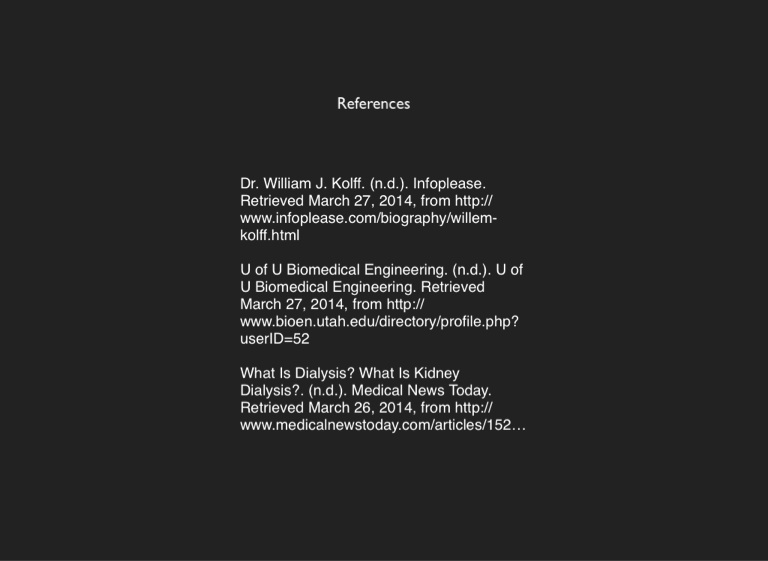 Dr. William J. Kolff. (n.d.). Infoplease. Retrieved March 27, 2014, from http://www.infoplease.com/biography/willem-kolff.html