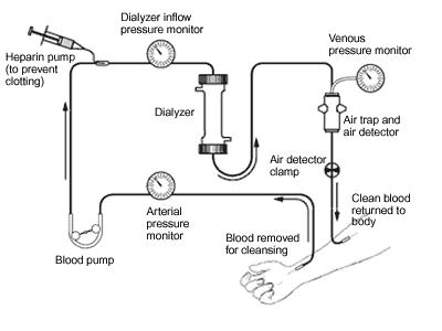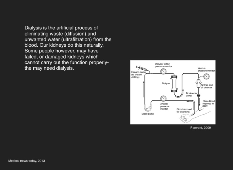 Dialysis is the artificial process of eliminating waste (diffusion) and unwanted water (ultrafiltration) from the blood. Our kidneys do this naturally. Some people however, may have failed, or damaged kidneys which cannot carry out the function properly- the may need dialysis.