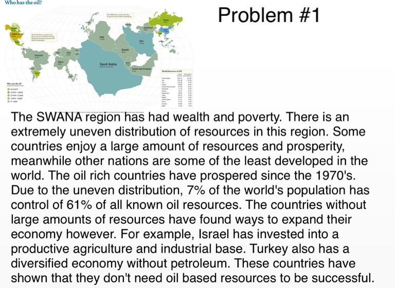 The SWANA region has had wealth and poverty. There is an extremely uneven distribution of resources in this region. Some countries enjoy a large amount of resources and prosperity, meanwhile other nations are some of the least developed in the world. The oil rich countries have prospered since the 1970's. Due to the uneven distribution, 7% of the world's population has control of 61% of all known oil resources. The countries without large amounts of resources have found ways to expand their economy however. For example, Israel has invested into a productive agriculture and industrial base. Turkey also has a diversified economy without petroleum. These countries have shown that they don't need oil based resources to be successful.