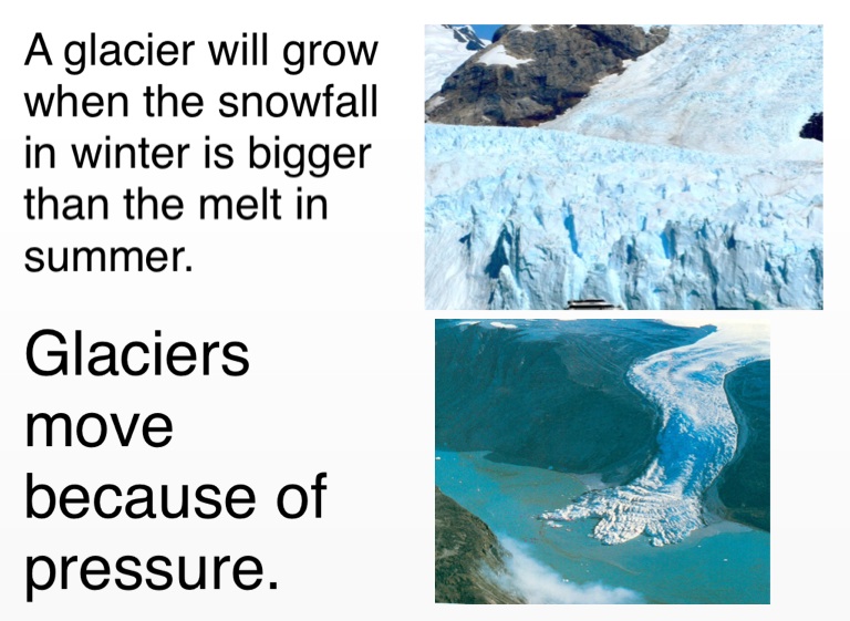 A glacier will grow when the snowfall in winter is bigger than the melt in summer.