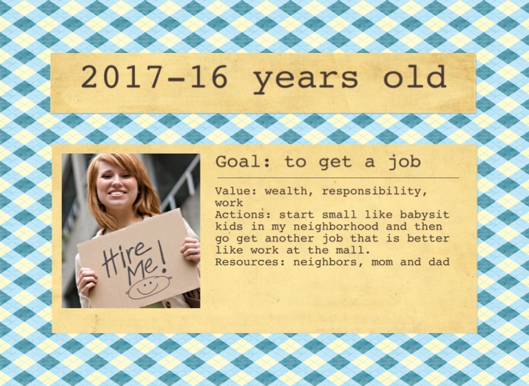 Actions: start small like babysit kids in my neighborhood and then go get another job that is better like work at the mall.