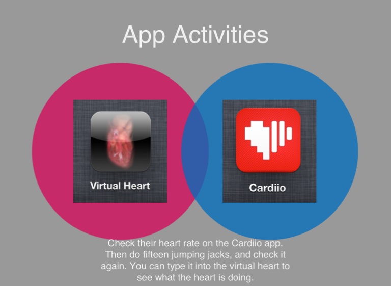 Check their heart rate on the Cardiio app. Then do fifteen jumping jacks, and check it again. You can type it into the virtual heart to see what the heart is doing.