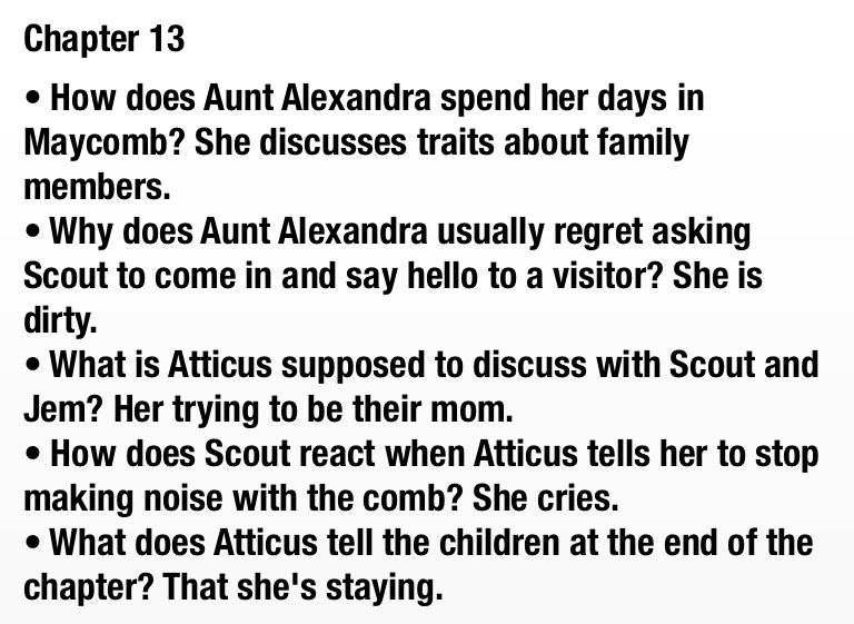 • What does Atticus tell the children at the end of the chapter? That she's staying.