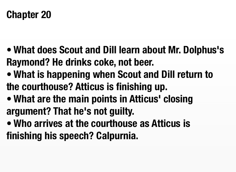 • What does Scout and Dill learn about Mr. Dolphus's Raymond? He drinks coke, not beer.