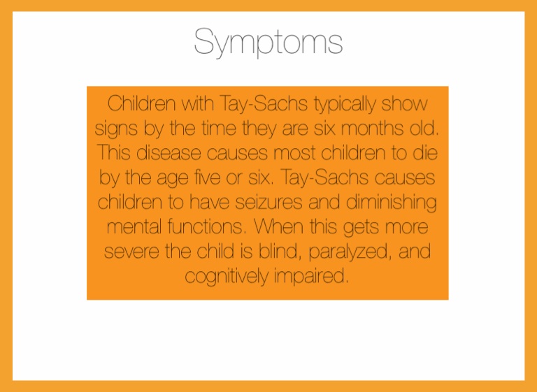 Children with Tay-Sachs typically show signs by the time they are six months old. This disease causes most children to die by the age five or six. Tay-Sachs causes children to have seizures and diminishing mental functions. When this gets more severe the child is blind, paralyzed, and cognitively impaired.