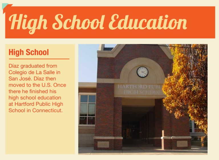 Díaz graduated from Colegio de La Salle in San José. Díaz then moved to the U.S. Once there he finished his high school education at Hartford Public High School in Connecticut.