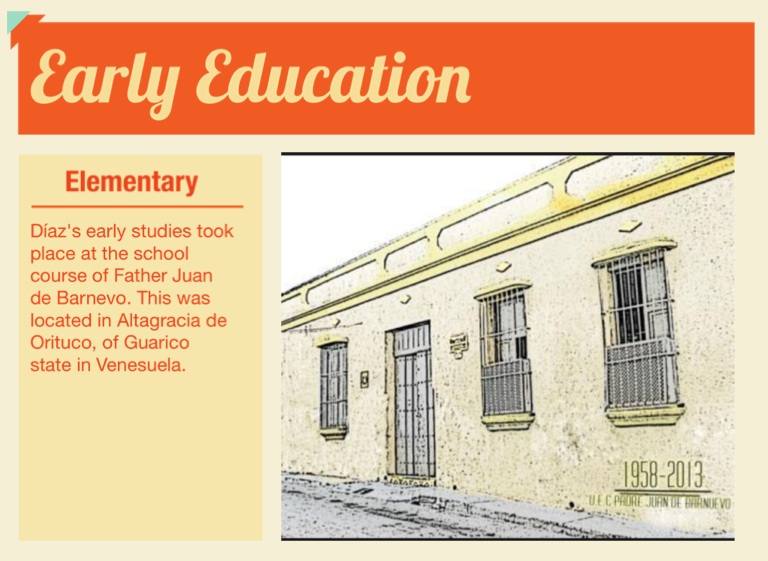 Díaz's early studies took place at the school course of Father Juan de Barnevo. This was located in Altagracia de Orituco, of Guarico state in Venesuela.