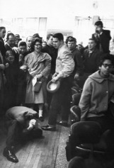 A white college student participating in a sit-in in Nashville was first subjected to verbal abuse, and then beaten, February 27, 1960. UPI Telephoto.