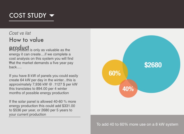 This product is only as valuable as the energy it can create....if we complete a cost analysis on this system you will find that the market demands a five year pay back.....