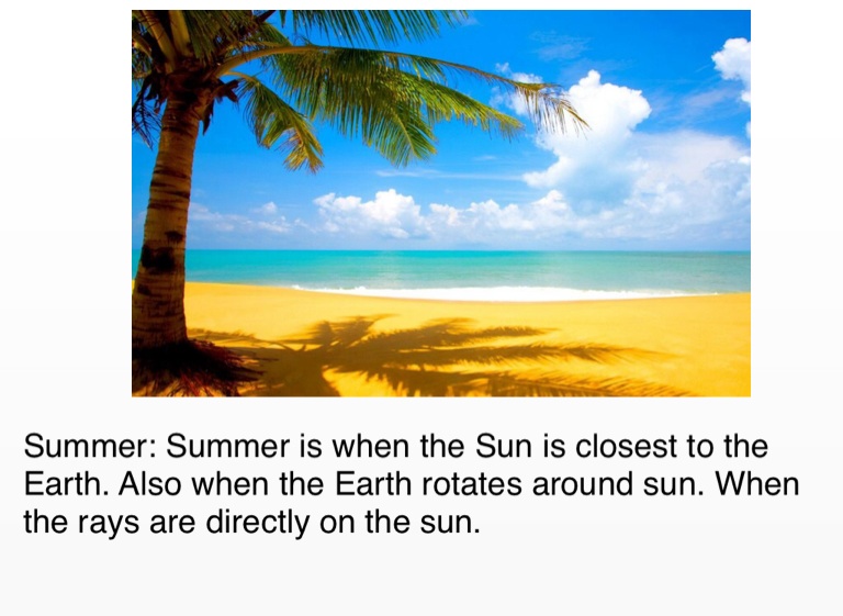 Summer: Summer is when the Sun is closest to the Earth. Also when the Earth rotates around sun. When the rays are directly on the sun.