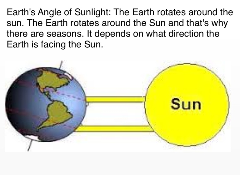 Earth's Angle of Sunlight: The Earth rotates around the sun. The Earth rotates around the Sun and that's why there are seasons. It depends on what direction the Earth is facing the Sun.