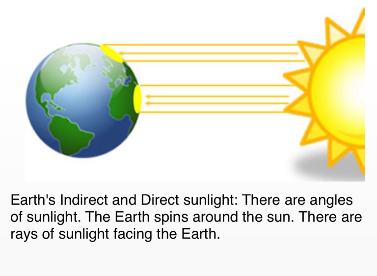 Earth's Indirect and Direct sunlight: There are angles of sunlight. The Earth spins around the sun. There are rays of sunlight facing the Earth.