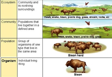 The smallest unit of organization is a single organism, which belongs to a population of other members of its species. The community and abiotic factors together form an ecosystem.