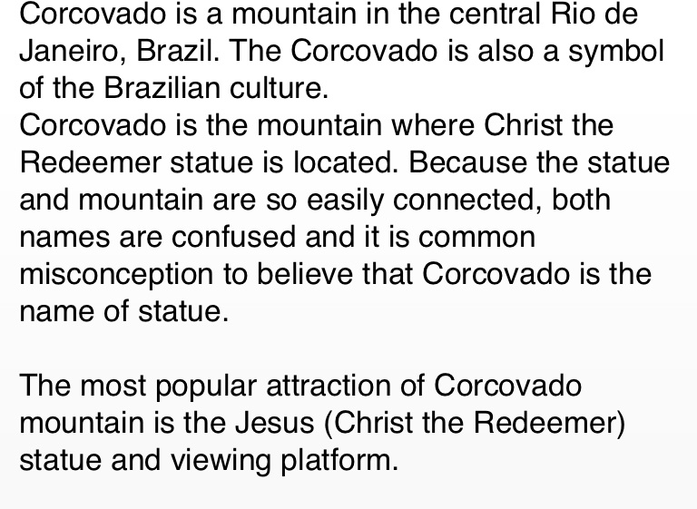 Corcovado is the mountain where Christ the Redeemer statue is located. Because the statue and mountain are so easily connected, both names are confused and it is common misconception to believe that Corcovado is the name of statue.